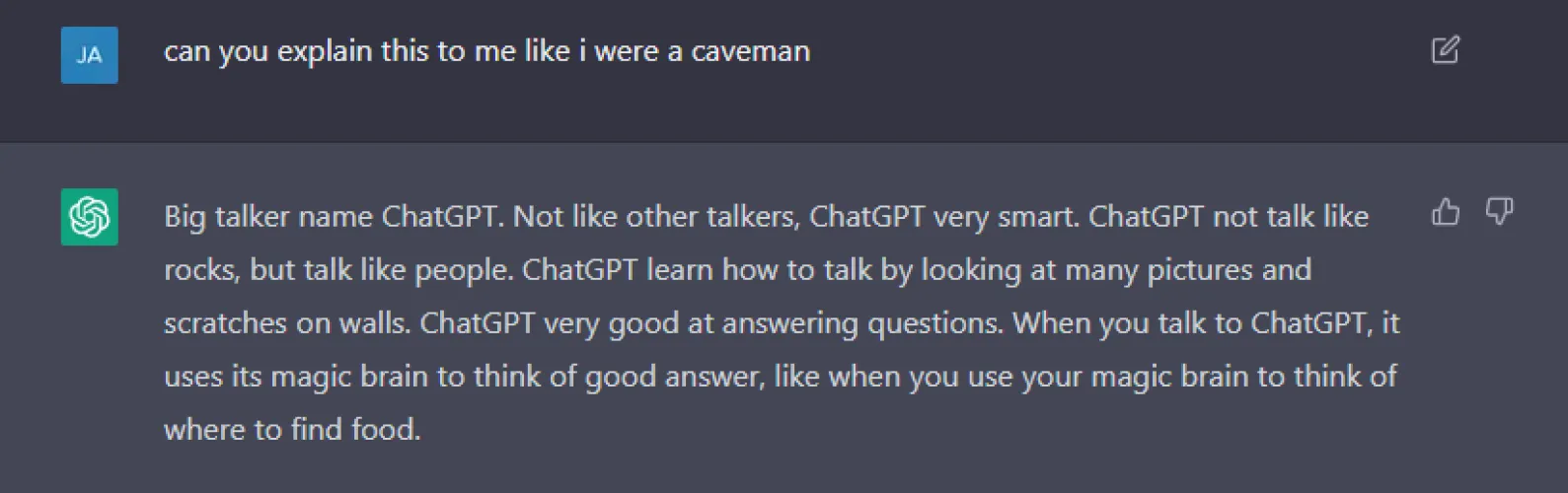 但你可以从这里继续走下去。为了搞笑,我让ChatGPT向我解释,就像我是一个山顶洞人一样,它确实做到了。这没有太多的实际用途,但它确实表明了根据您的舒适度量身定做应对措施是多么容易。如果你是一个很难理解微积分之类的东西的学生,ChatGPT可以解释某个概念,并调整反应,直到它有意义,就像人工智能家教一样。