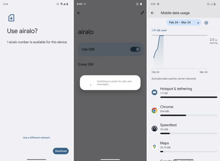 惠特利说,Airalo的应用程序由“绝大多数”客户安装,提供实时数据使用指标。我没有费心安装它,因为我试图在尽可能少的步骤中设置服务。