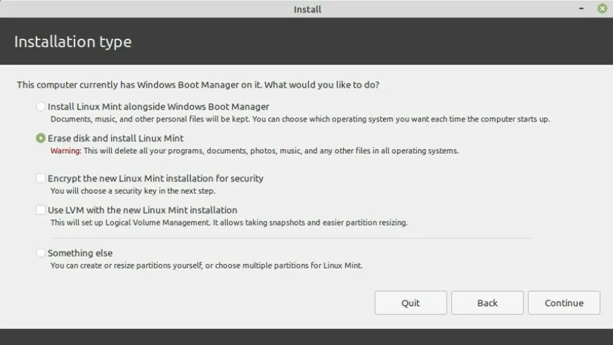 一定要选中安装第三方软件旁边的框,因为它包含您几乎肯定想要的有用的驱动程序和编解码器。从这里,你可以完全擦除你的驱动器,擦除所有Windows的痕迹,并使用Linux作为你唯一的操作系统。(在执行此操作之前,请确保备份了数据。)