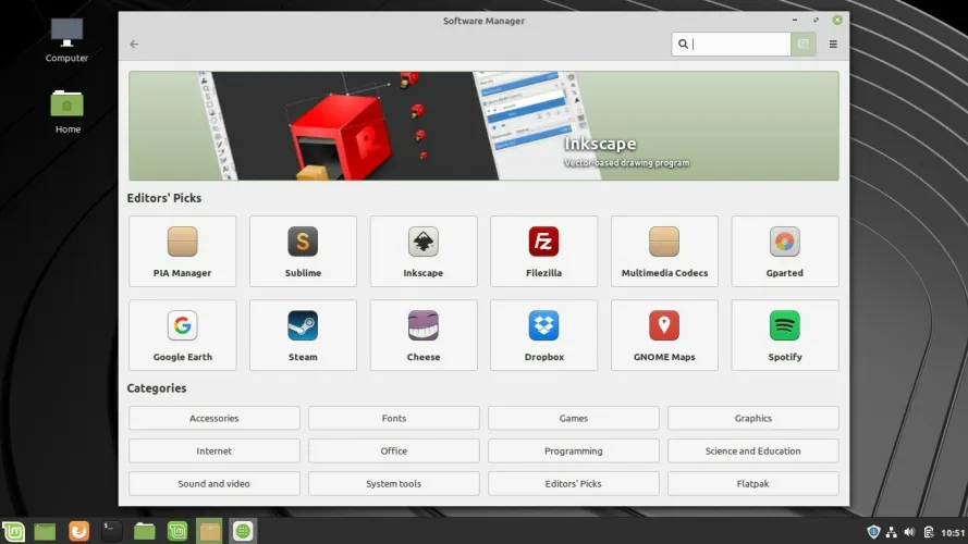 要打开Linux Mint的软件管理器,点击左下角的菜单按钮,进入管理>软件管理器界面(或者像在Windows中那样,开始输入“软件管理器”)。在这里,你可以浏览要下载的应用程序,或者使用顶部的栏进行搜索。