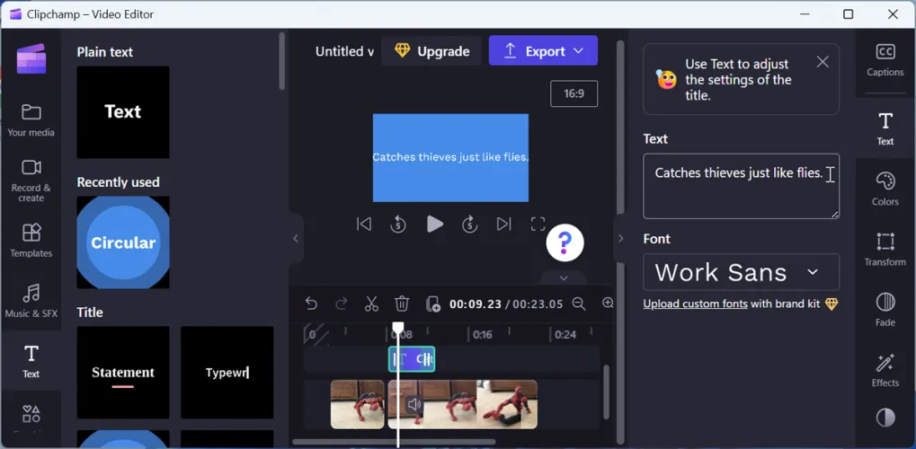 如果要裁切视频,请将时间轴上的开始标记和结束标记移动到您喜欢的位置。使用左侧工具栏,您可以将音乐和特效、文本、图形、库存图像和过渡添加到视频中。右侧的工具栏可用于微调任何文本、添加面孔和调整颜色。