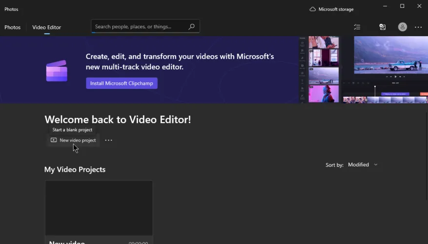 在Windows 10中,从开始菜单打开照片。在Windows 11中,如果您决定安装Photos Legacy,请打开它。单击顶部的视频编辑器选项卡,然后单击新建视频项目按钮,命名您的视频项目,然后单击确定开始。
