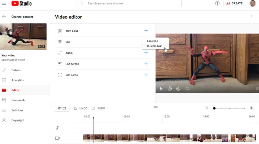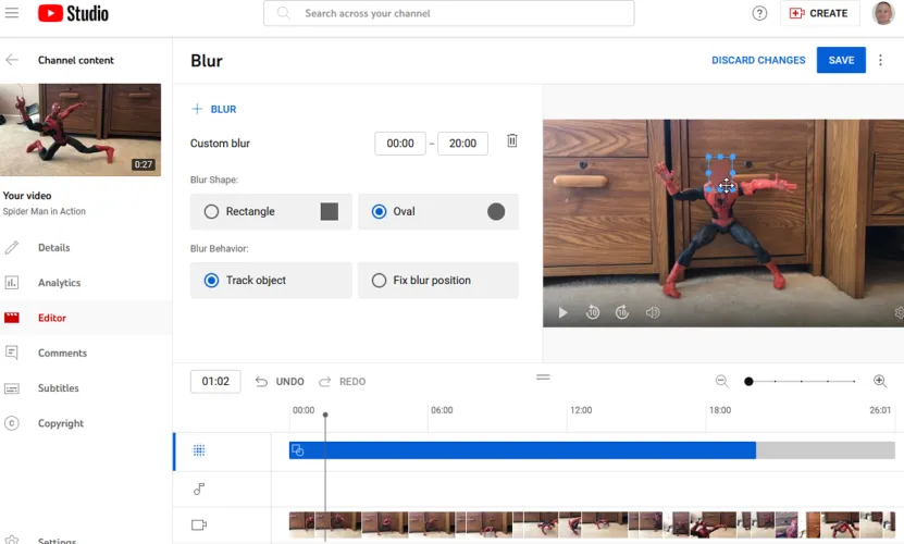 如果您的视频包含公共场合的人的可见面部或您希望保持隐私的其他对象,您可能希望对它们进行模糊处理。要执行此操作,请单击模糊的命令。选择人脸模糊,YouTube将尝试检测视频中的任何人脸并自动对其进行模糊处理。要获得更好的控制,请选择自定义模糊以使矩形模糊显示在视频上。
