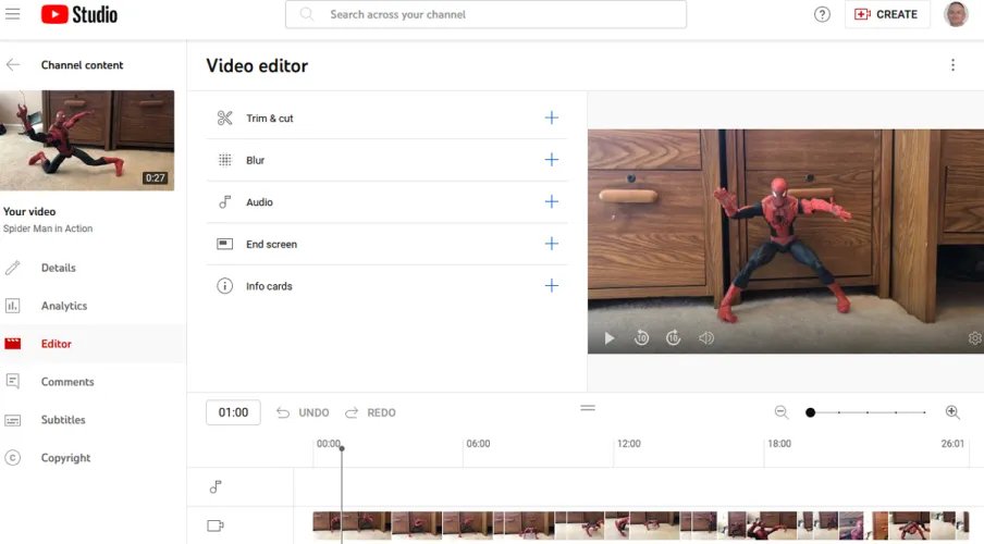 然后,您可以单击仪表板侧边栏上的内容条目,并选择要编辑的视频的缩略图。在详细信息窗口中,单击编辑器的条目。该编辑器使您能够裁剪视频、模糊面部或其他对象,以及添加音乐或其他音频。