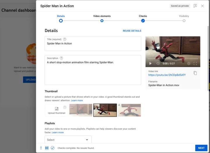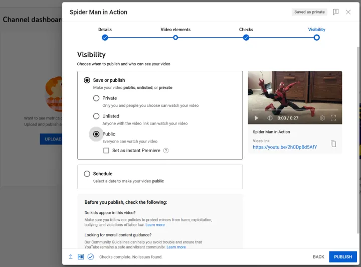 继续到视频元素屏幕,您可以在其中添加字幕、结束屏幕和标题卡。单击检查以查看您的视频是否侵犯了任何版权。最后,转到可见性,并决定您希望视频是公开的还是私有的。完成后,单击保存以获取私人视频,或单击发布以获取公共视频。