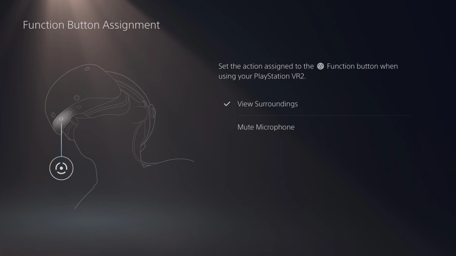 PS VR2的功能按钮位于耳机的右下角,可以根据您的喜好进行定制。打开附件>PlayStation VR2>PS VR2设置>功能按钮分配。选择按下功能按键时的功能,例如将麦克风静音或查看周围环境。例如,后者可以让你快速了解你周围的真实世界,而不必摘下耳机。