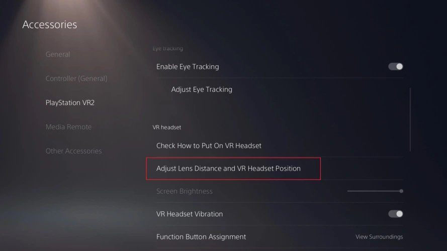PS VR2耳机配有两个镜头,可以调整以匹配您的眼睛之间的距离,并提高图像的清晰度。打开附件>PlayStation VR 2>PS VR2设置,然后选择调整镜头距离和VR耳机位置。使用耳机底部的刻度盘将它们靠近或分开,直到您看到清晰的图像。这可以在不访问设置页面的情况下完成,但该页面会通过屏幕上的视觉效果指导您完成这一过程,并向您显示镜片何时放置在正确的位置。