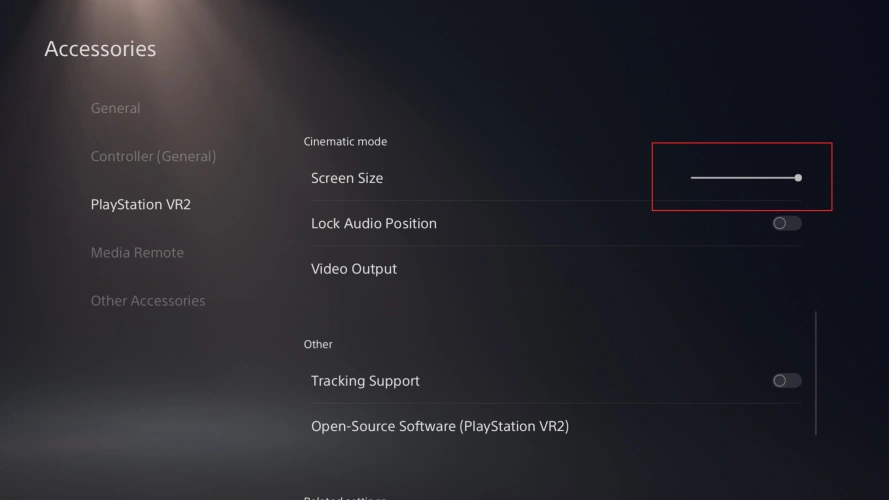 更好的是,当你以这种方式使用耳机时,你可以扩大屏幕尺寸,这样你就像坐在电影院的前排一样。你不需要伸长脖子就能看到屏幕。要做到这一点,请进入主屏幕,然后选择附件>PlayStation VR2>PS VR2设置,并使用屏幕大小滑块将其设置为您想要的大小。