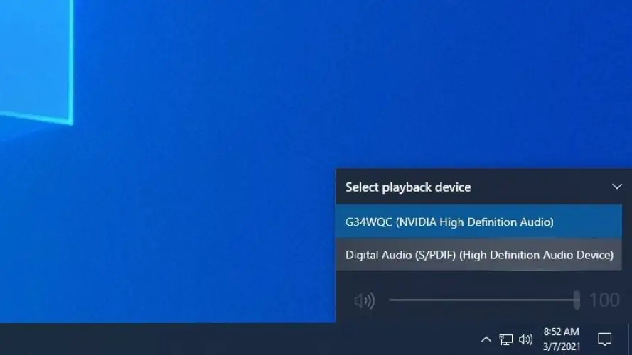 对于仍在使用Windows 10的用户,请点击声音图标,然后选择弹出窗口顶部的文本。然后,您应该看到连接到您的计算机的所有音频设备的列表。选择你想要的,或者-如果你不确定哪个列表与哪套扬声器或耳机相对应-尝试不同的选项,直到正确的选项起作用。
