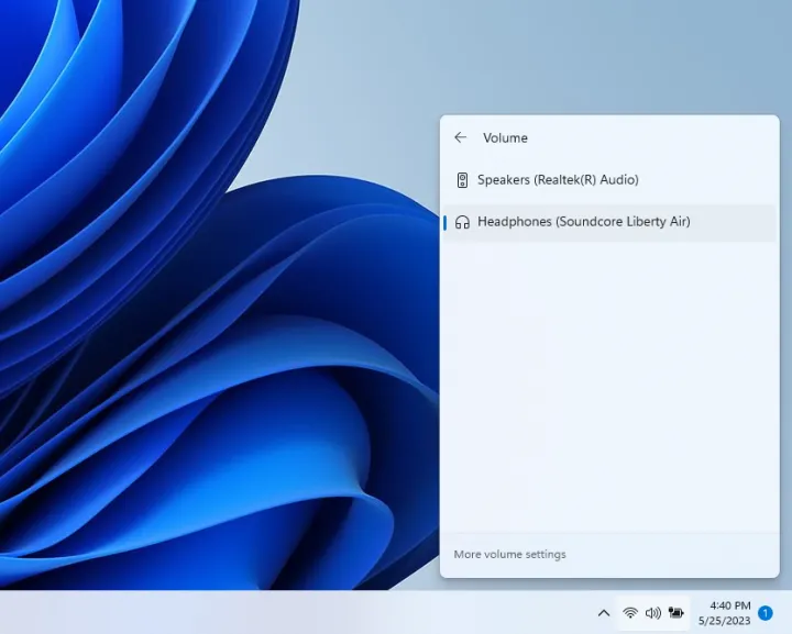 值得庆幸的是,现在Windows中的输出设备切换比过去容易多了。如果您使用的是Windows 11,请单击任务栏右下角的声音图标,然后单击音量栏旁边的箭头以查看可用的输出设备列表。