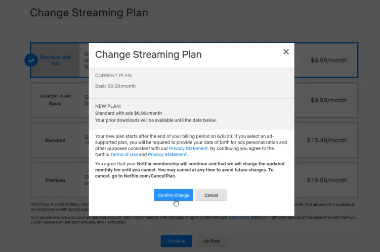 如果您希望更改您的流计划而不是取消,您可以在您的帐户的计划详细信息页面中单击更改计划链接。将出现一个新的屏幕,比较该服务的不同计划。