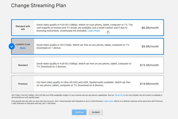假设您想要缩减流媒体以降低价格,请单击较便宜的选项之一,这可能会降低流媒体的质量、减少支持的设备数量或引入支持广告的视频。