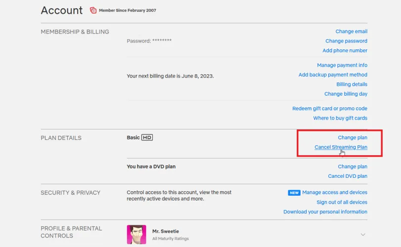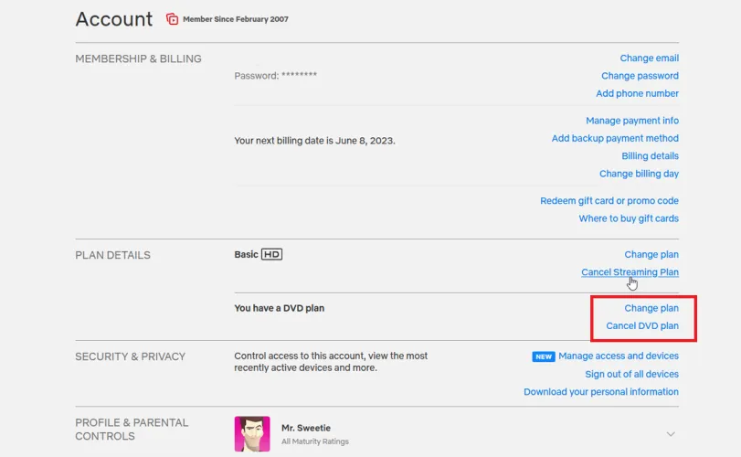 Netflix仍然提供DVD计划,尽管它将在2023年9月关闭。如果您为计划付费,但已设置为离开物理光盘的世界,请转到您的帐户页面,然后在计划详细信息部分单击取消DVD计划。