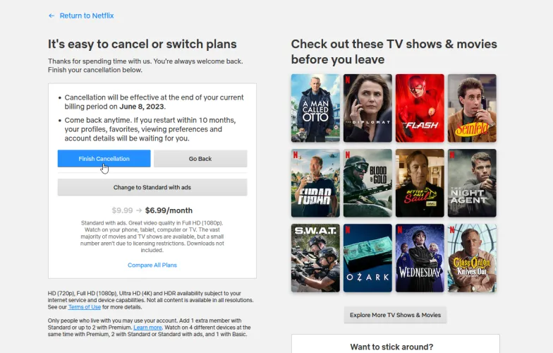 然后,Netflix会试图通过提出一个更便宜的计划来留住你。单击完成取消以确认您的选择。您的流媒体计划将在当前计费周期结束时取消。该日期将列在页面上。