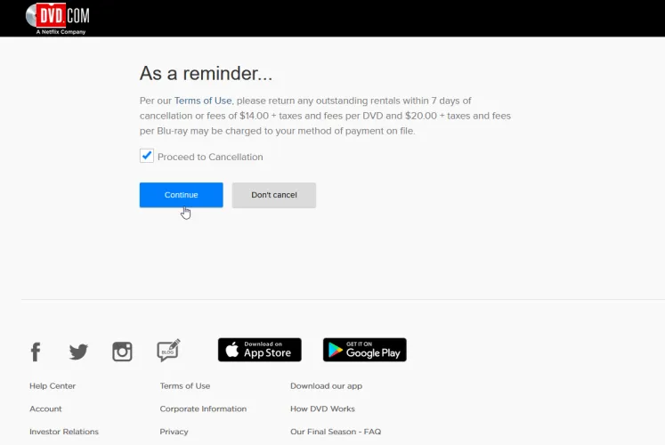 Netflix通知您,您发行的所有DVD必须在取消后七天内退还。选中继续取消旁边的框,然后单击继续。尽管这项服务即将消亡,但Netflix仍将试图说服你再坚持一段时间,选择暂停发货或改变计划。