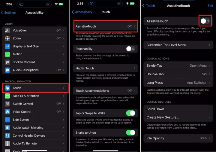 AssistiveTouch是一个辅助功能,可以让你创建一个虚拟主页按钮,然后设置轻击、双击或长按的功能。在您的设备上,进入设置>辅助功能>触摸>辅助触摸,然后打开辅助触摸选项。