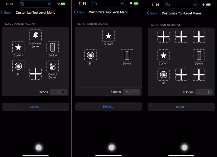 在AssistiveTouch设置屏幕中,点击Customize Top Level菜单的条目以更改图标并添加或删除图标。默认情况下,菜单显示六个图标,但您可以使用底部的加号和减号按钮来增加或减少该数字。您始终可以点击Reset(重置)恢复到默认号码。