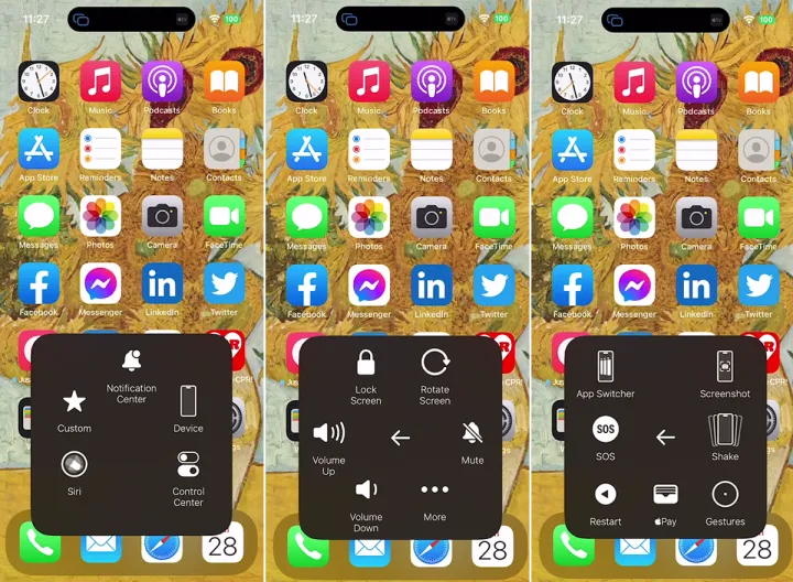 如果点击设备,您现在可以访问各种控制,如锁屏、旋转屏幕、调高音量、调低音量和静音。点击更多图标可以访问更多控件,如多任务、SOS、重新启动、Apple Pay、屏幕截图和Shake。
