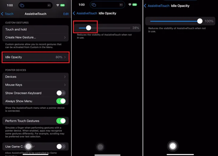 您可以更改Home按钮的不透明度以使其更亮或更暗。在AssistiveTouch设置屏幕上,点击空闲不透明度并拖动滑块以使按钮更暗或更亮。