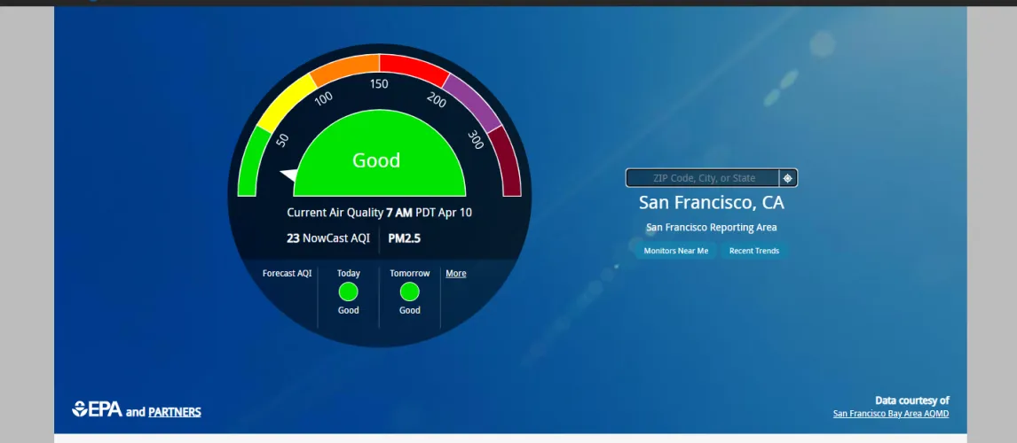 AIRNow允许用户搜索特定地区的条件,然后提供颜色编码的AQI,并显示该地区的主要污染物(及其浓度)。该网站还显示了该地区当前空气质量的地图,未来几天的预报,以及来自世界各地的野火和美国大使馆读数的信息。