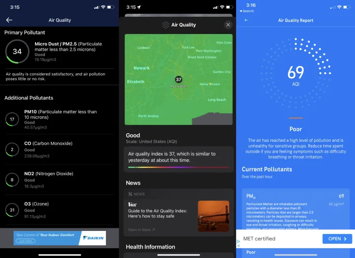 在iOS上,BreezoMeter的数据似乎已经被合并到苹果的Weather应用程序中(在一个新窗口中打开)。加载您的位置,并点击空气质量检查它。