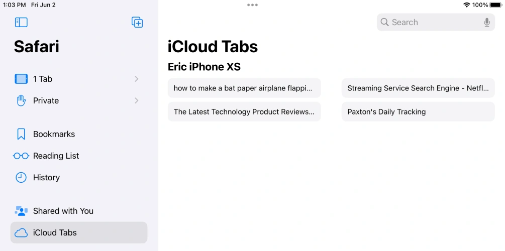 现在,当你在iPad上打开Safari,点击左侧导航栏上的Tabs按钮(看起来像一个方框与另一个方框重叠),你会看到一个iCloud Tabs条目。轻触以查看您的其他设备上打开的选项卡列表。(注:您在一台设备上打开的选项卡可能需要几分钟才能显示在另一台设备上;转接速度更快。)