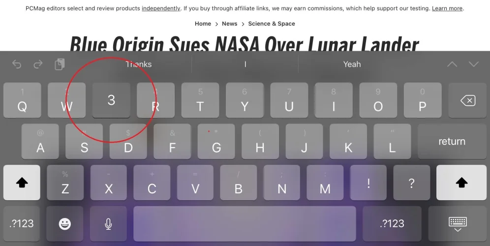 注意,iPadOS键盘上的每个字母在字母上方也有一个对应的灰色符号。这些是在按空格键两侧的Shift键时获得的符号、标点或数字。但你不必换挡:只需快速向下滑动单个键即可。例如,轻触E键可以得到E,但向下滑动它会得到3。