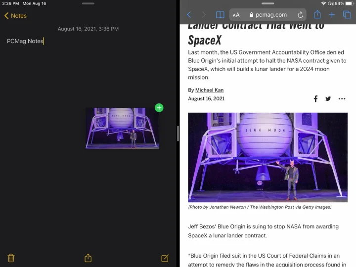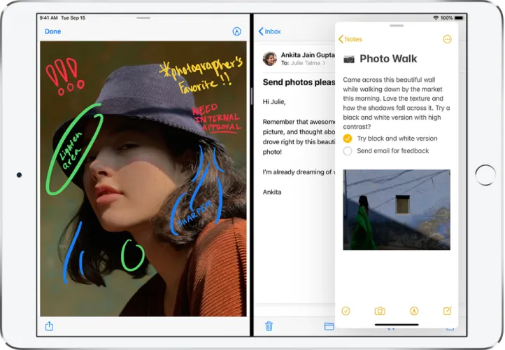 例如,设置拆分视图窗口,并在Notes旁边设置Safari,您可以复制文本(按下一个单词以选择它,然后拖动以选择更多)和URL。它还可以处理图片。例如,打开邮件、消息或便笺旁边的照片应用程序,可以拖放令人难忘的数字图像,以便在全新的环境中共享或保存。您甚至可以拖动多张照片。