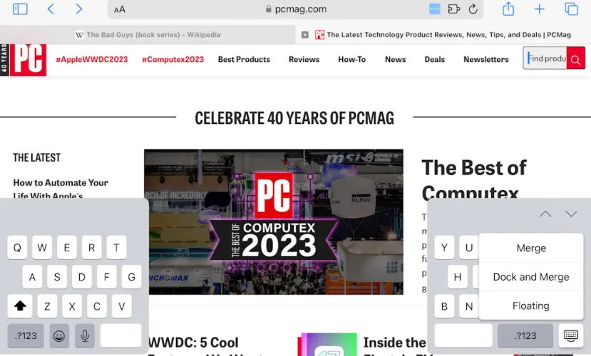 当键盘在屏幕底部打开时,长按右下角的键盘键。菜单选项包括Undock(使键盘“浮动”)、浮动(这样你就可以得到一个iPhone大小的迷你键盘,可以放在屏幕上的任何地方)和Split(上图)。要撤消选择,请再次长按,然后点击合并。
