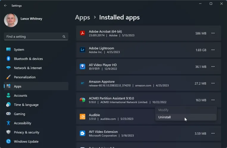 该屏幕显示了您PC上安装的所有程序,包括Windows通用应用程序和标准桌面应用程序。向下滚动列表以找到要删除的程序。在Windows 10中直接点击它,或在Windows 11中点击三点图标,然后选择卸载。