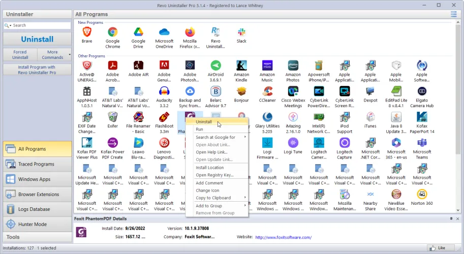 要在操作中尝试Revo,请双击要删除的程序,或右键单击它并选择卸载。Revo首先创建一个恢复点,如果事实证明它在删除关联文件和注册表项方面过于激进,您可以回退到该点。接下来,Revo调用程序自己的卸载例程来删除它。