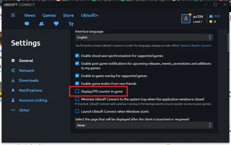 如果您使用Ubisft Connect桌面应用程序来玩Ubisft游戏,请单击汉堡菜单并选择设置>常规,然后启用在游戏中显示FPS计数器选项以调出游戏中的FPS检查器。