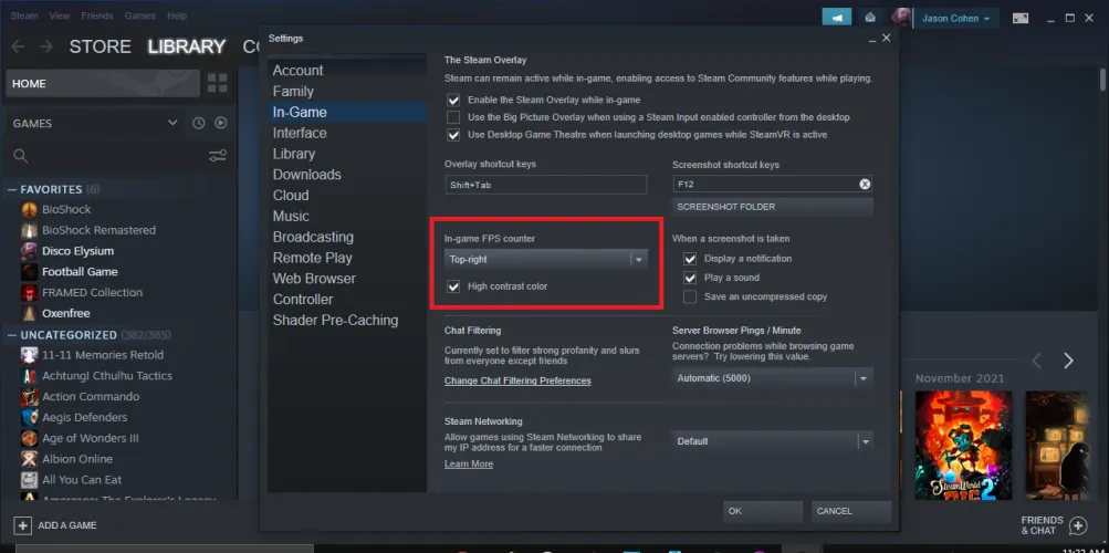 如果你是在STeam上推出一款游戏,即使这是一款你没有在STeam上购买的游戏,你也可以使用Launcher的游戏内帧速率计数器来衡量性能。在STeam上,打开设置>游戏中>游戏中FPS计数器。在下拉列表中选择一个位置以将其打开。