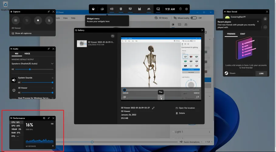 由于Xbox游戏栏的覆盖,您的Windows PC还配备了内置的FPS计数器(和屏幕记录器)。您可以使用Win+G快捷键启动此功能,性能数据-CPU、GPU、VRAM、RAM和FPS-将从左下方的小部件显示出来。