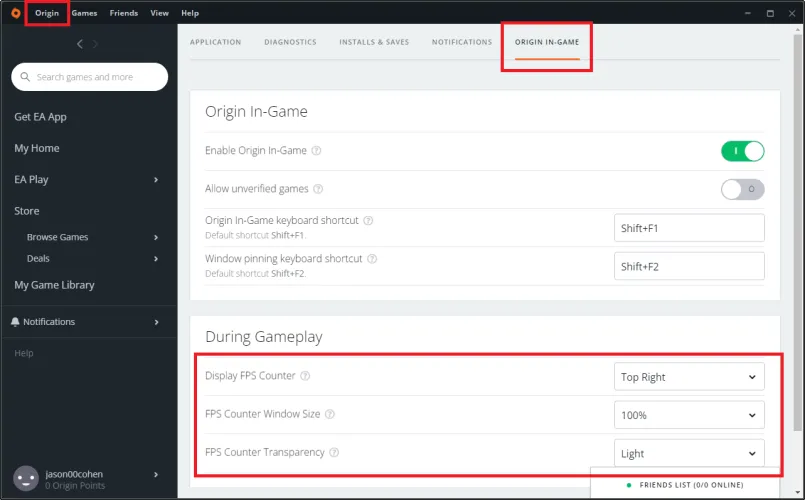 在原点中,您可以单击顶部的原点选项卡,然后选择应用程序设置。选择游戏中的原点标题,然后使用显示FPS计数器下拉菜单来选择它应该在屏幕上显示的位置。然后,您可以更改游戏中计数器的大小和透明度。