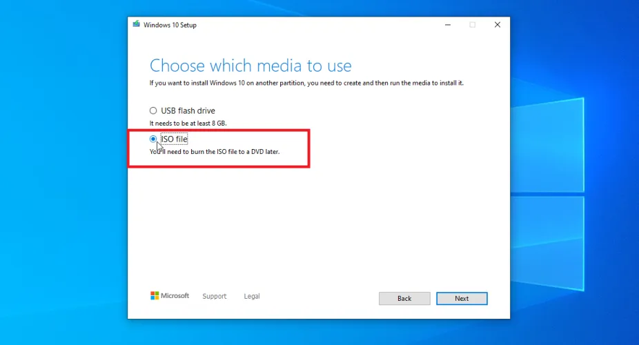 然后要求您选择要使用的媒体。虽然您最终希望从USB驱动器运行Windows,但请单击ISO文件选项,然后单击下一步。在驱动器上选择存储Windows ISO文件的位置。单击保存,使Windows生成所需的ISO文件。该过程完成后,请单击Finish。