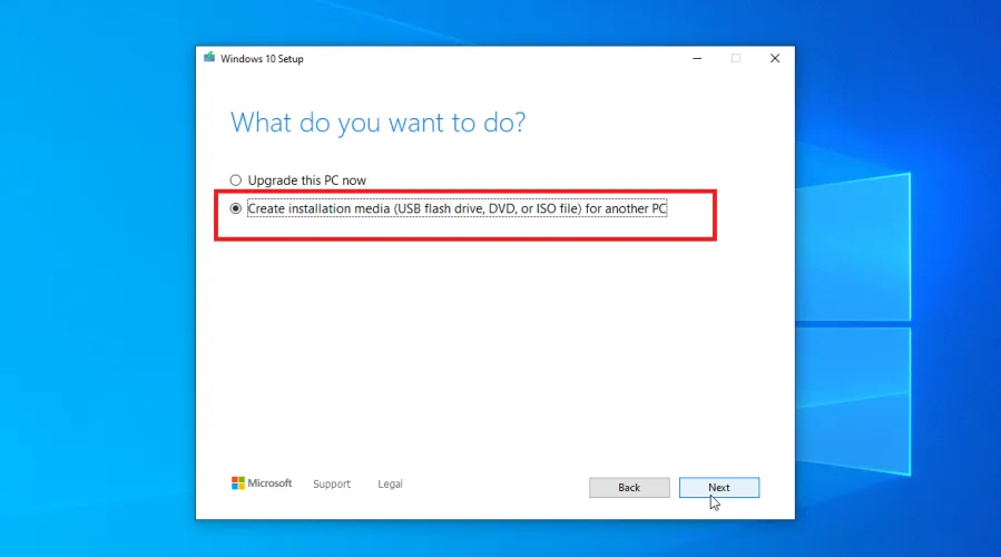 在第一个屏幕中,单击访问按钮,然后选择为另一台PC创建安装介质(USB闪存驱动器、DVD或ISO文件)选项,然后单击下一步。确认语言、体系结构和版本都正确,然后单击Next。