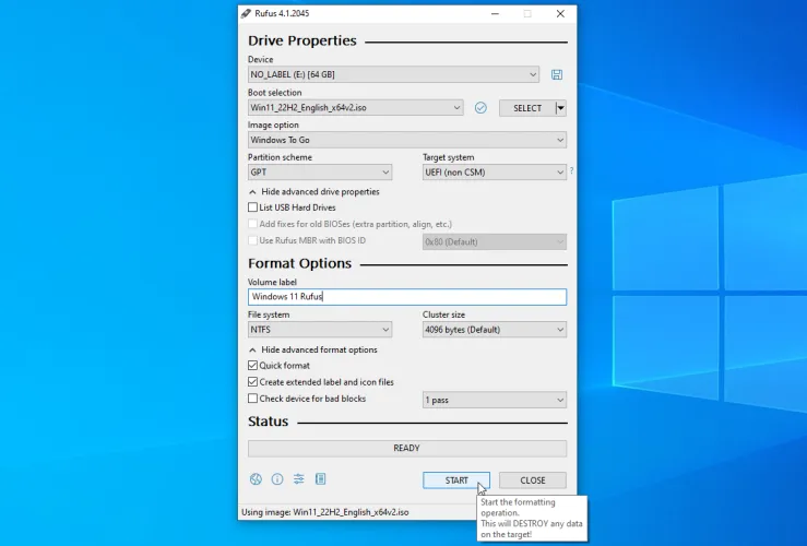 您也可以使用实用程序rufus(在新窗口中打开)。下载、安装并启动该程序。在Device(设备)字段中选择您的USB驱动器(如果尚未选中)。单击引导选择字段旁边的选择按钮,然后选择您保存的Windows ISO文件。单击图像选项字段并将其更改为Windows To Go。