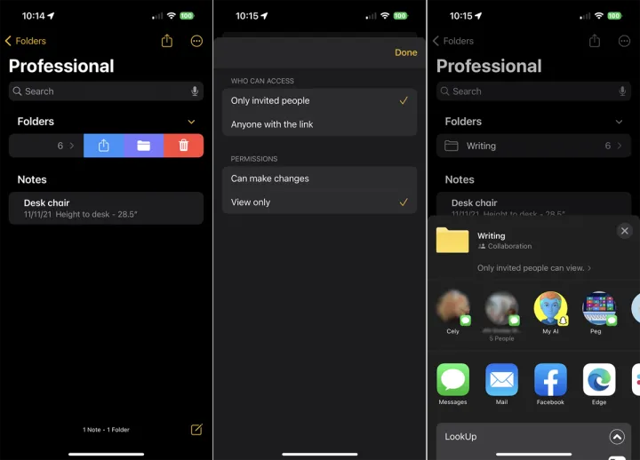 您可以与其他人共享笔记和文件夹,授予他们仅查看或进行更改的权限。您甚至可以创建一个专门用于共享的新文件夹。向左滑动您要共享的文件夹,然后点击蓝色共享图标。或者,打开便笺,点击顶部的省略号图标,然后选择共享便笺。