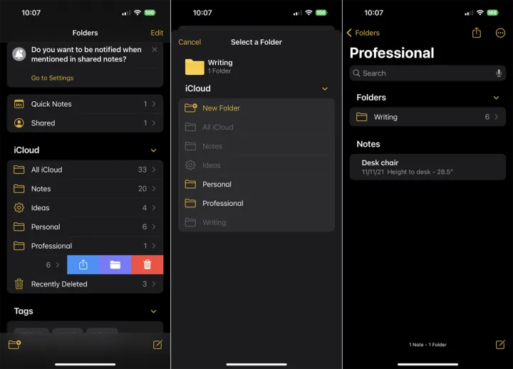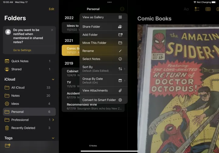 打开特定的文件夹或子文件夹,省略号图标提供了许多其他命令和选项,包括共享文件夹、排序笔记、添加新文件夹、移动文件夹、重命名文件夹以及将其转换为智能文件夹。