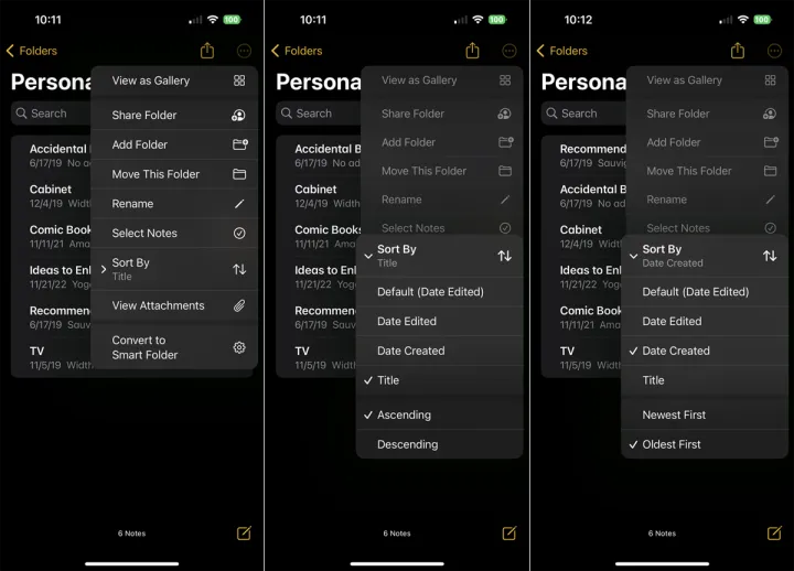 您可以更改文件夹中便笺的排序方式。打开文件夹,点击省略号图标,然后选择排序依据选项。默认情况下,所有便笺都按上次编辑的日期排序,但您可以改为按创建日期或标题排序,并进一步按最旧到最新或最新到最旧(或按A-Z或Z-A,如果按标题排序)进行排序。