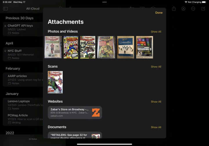 想要查看您存储在Notes应用程序中的所有照片和附件吗?只需轻触省略号图标并选择查看附件,即可打开包含所有附加媒体的窗口。