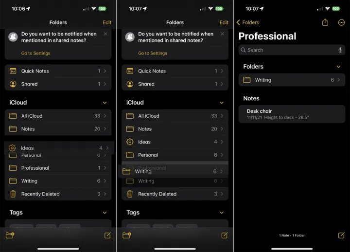 笔记应用程序可以让你轻松地组织你的文件夹和笔记。按下便笺或文件夹并将其拖动到列表中的其他位置。如果将一个文件夹拖到另一个文件夹上,则会将其转换为子文件夹。在您打开父文件夹之前,新的子文件夹将隐藏起来。