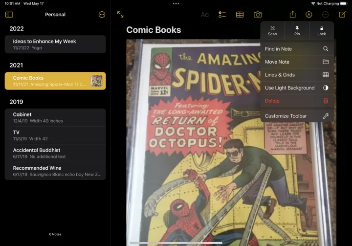 您也可以为个别笔记打开类似的菜单。只需轻触省略号图标即可访问各种命令,这些命令允许您扫描、锁定、锁定、删除、共享、发送、搜索、移动、格式化和打印笔记。