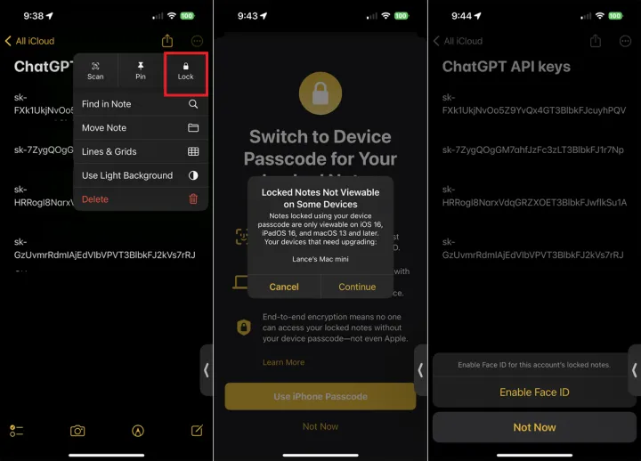 在iOS 16和iPadOS 16中,你可以通过自定义密码、设备登录密码、Touch ID或Face ID来保护笔记。请注意,如果你使用设备的密码或生物识别技术,你至少需要iOS 16、iPadOS 16或MacOS 13 Ventura才能在另一台设备上查看锁定的笔记。
