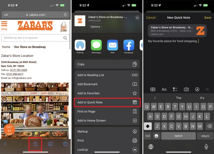 您还可以从应用程序创建快速便笺,例如Safari中的网站、特定网页上的链接或任何屏幕上的选定文本。打开要保存到笔记的应用程序和内容,点击共享图标,然后选择添加到快速笔记。然后,您可以向便笺中添加其他文本,然后点击保存。