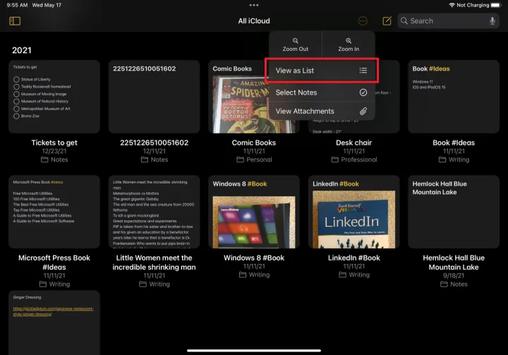 这将以缩略图的形式显示便笺,其中显示名称、便笺中的部分文本以及便笺中可能包含的任何照片。如果便笺被锁定,您将只看到名称和锁定图标,而不会看到文本或图像预览。您可以通过点击省略号图标并选择按列表查看来返回到列表视图。