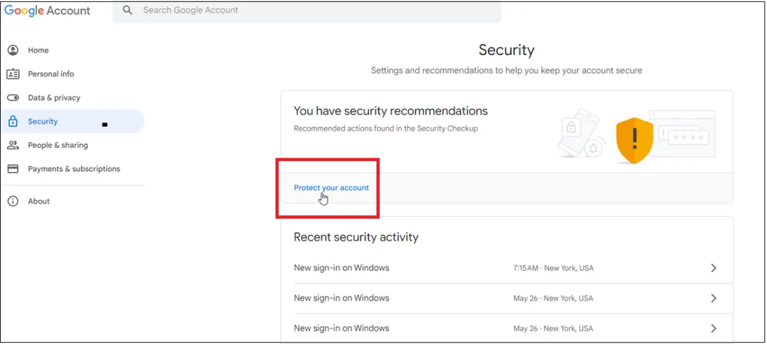 在浏览器中打开Google安全页面(在新窗口中打开),然后使用您的Google帐户登录。在你做任何事情之前,谷歌会立即检测到任何潜在的安全问题。如果您看到“您有安全建议”字样,请选择“保护您的帐户”链接以查看您可以修复的内容。