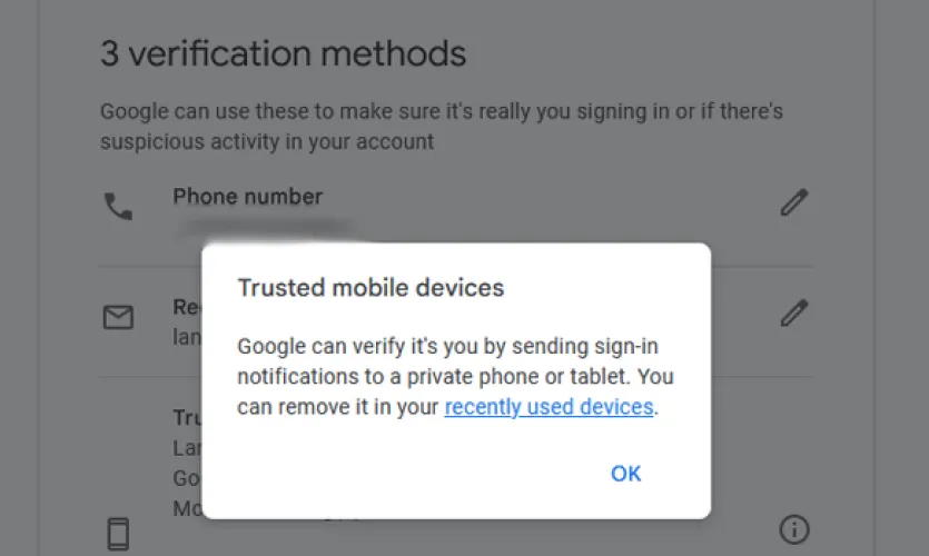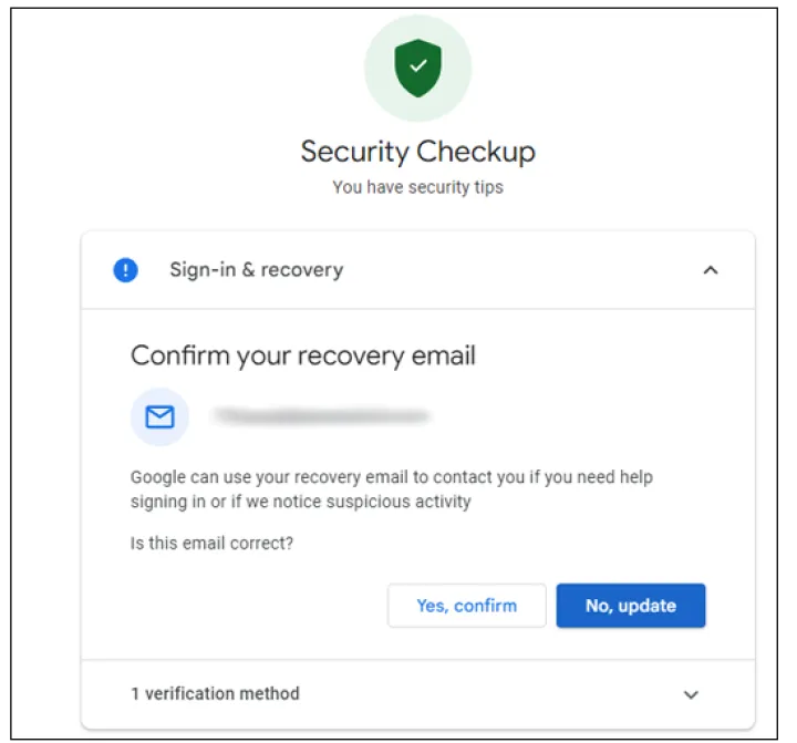 谷歌可能建议更新的一些恢复信息包括恢复电子邮件、您的电话号码、安全问题和受信任的移动设备。如果您已经有了有效的电子邮件或电话号码,请单击是,确认以保持原样。否则,请单击否、更新并重新输入您的密码以更改密码。