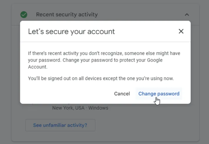 然后,系统将提示您更改密码。如果您执行此操作,请记住,您将需要重新登录使用您的Google帐户的所有其他设备。